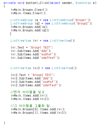 * C# Listview 컨트롤에 그룹화 항목 만들기 예제...