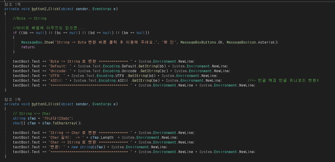 textBox1.Text += "ASCII: " + System.Text.Encoding.ASCII .GetString(be) + System.Environment.NewLine; //<- 한글 깨짐 한글 유니코드 변환X