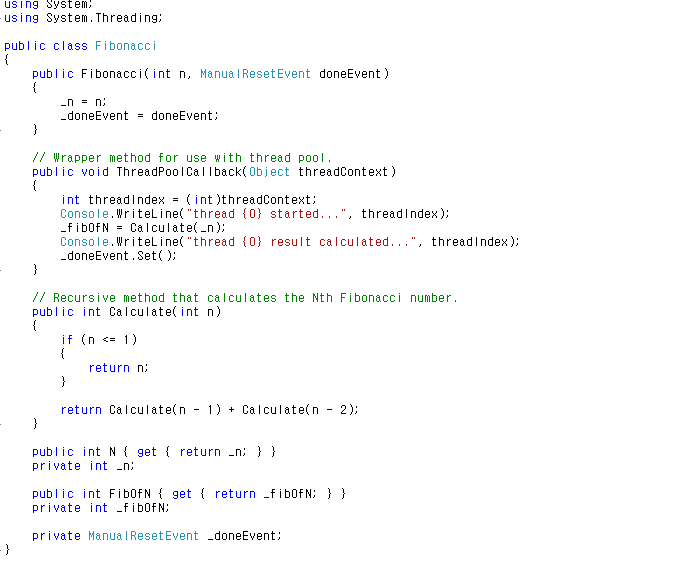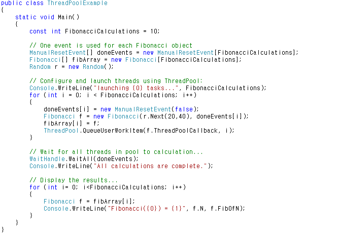 다음 예제에서는 .NET Framework 스레드 풀을 사용하여 20과 40 사이의 숫자 10개에 대한 Fibonacci 결과를 계산합니다. 각 Fibonacci 결과는 Fibonacci 클래스로 표현됩니다. 이 클래스는 계산을 수행하는 ThreadPoolCallback이라는 메서드를 제공합니다. 각 Fibonacci 값을 나타내는 개체가 작성되고 ThreadPoolCallback 메서드가 QueueUserWorkItem에 전달되면 이 메서드를 실행하기 위해 풀의 사용 가능한 스레드가 할당됩니다.