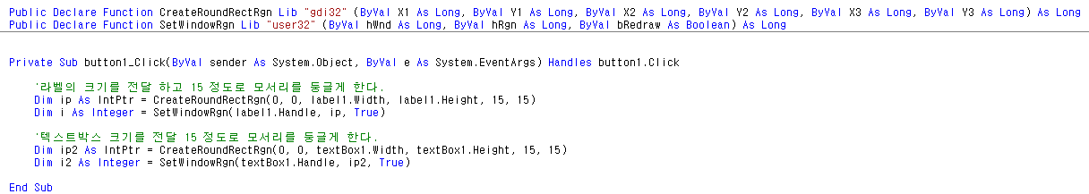 * VBNET API 를 이용한 컨트롤 (Control ) 모서리 둥글게 하기 예제...
