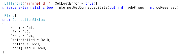 private extern static bool InternetGetConnectedState(out int lpdwFlags, int dwReserved);