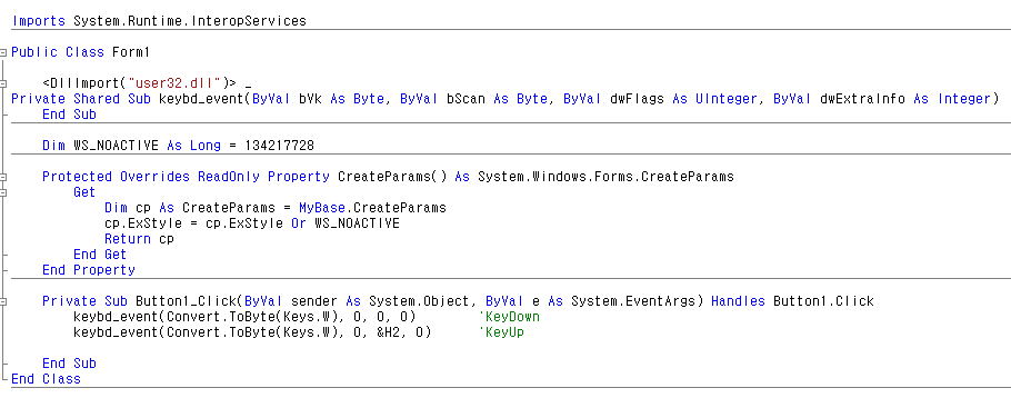 Private Shared Sub keybd_event(ByVal bVk As Byte, ByVal bScan As Byte, ByVal dwFlags As UInteger, ByVal dwExtraInfo As Integer)