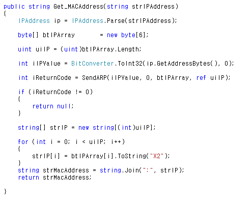 int iReturnCode = SendARP(iIPValue, 0, btIPArray, ref uiIP);