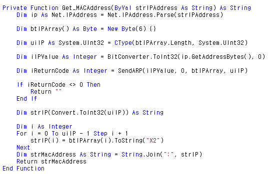 Dim iReturnCode As Integer = SendARP(iIPValue, 0, btIPArray, uiIP)