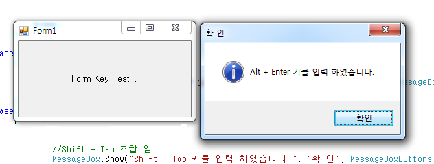 MessageBox.Show("Shift + Tab 키를 입력 하였습니다.", "확 인", MessageBoxButtons.OK, MessageBoxIcon.Asterisk)