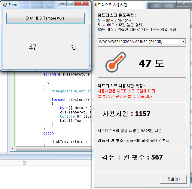 * C# WMI 를 이용한 하드 디스크 온도 체크 예제 (HDD Temperature)