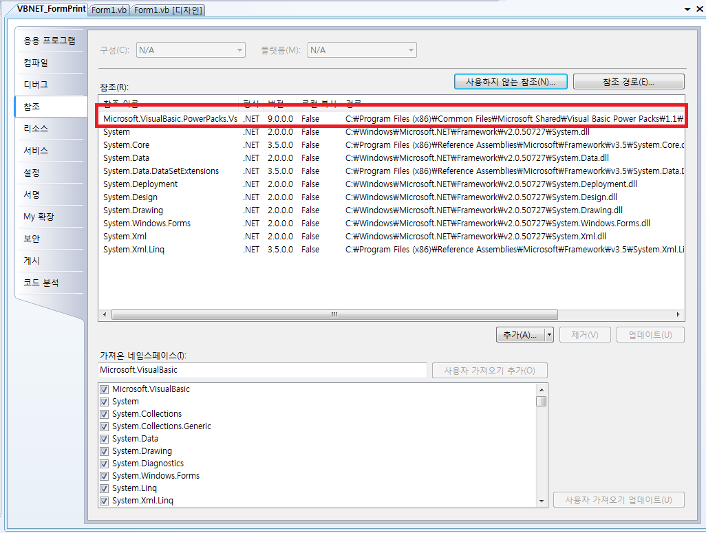 위 그림처럼 화면 구성에 printform 을 사용 하기 위해서는 Visual Basic PowerPack dll 이 필요합니다.