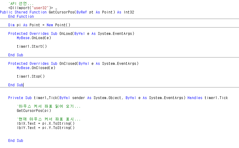 * VBNET API 를 이용한 마우스 커서 좌표 얻어 오기 예제...