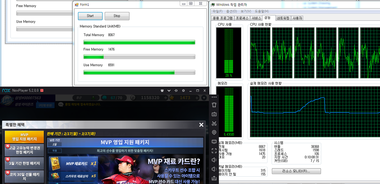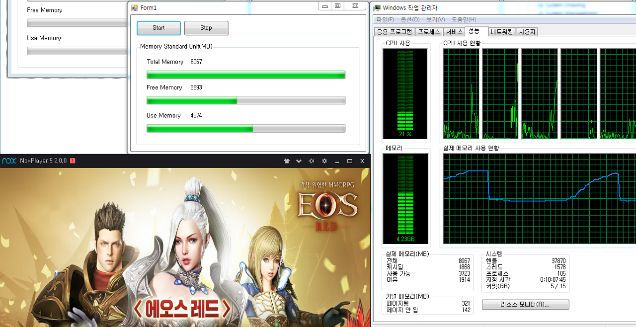 아래의 그림과 같이 NoxPlayer 를 켜고 난 뒤 게임을 실행 하면서 메모리 사용량이 변화 하는 것을 WMI 를 이용한