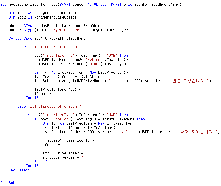 lvi.SubItems.Add(strUSBDriveName + " : " + strUSBDriveLetter + " 연결 되었습니다.")
