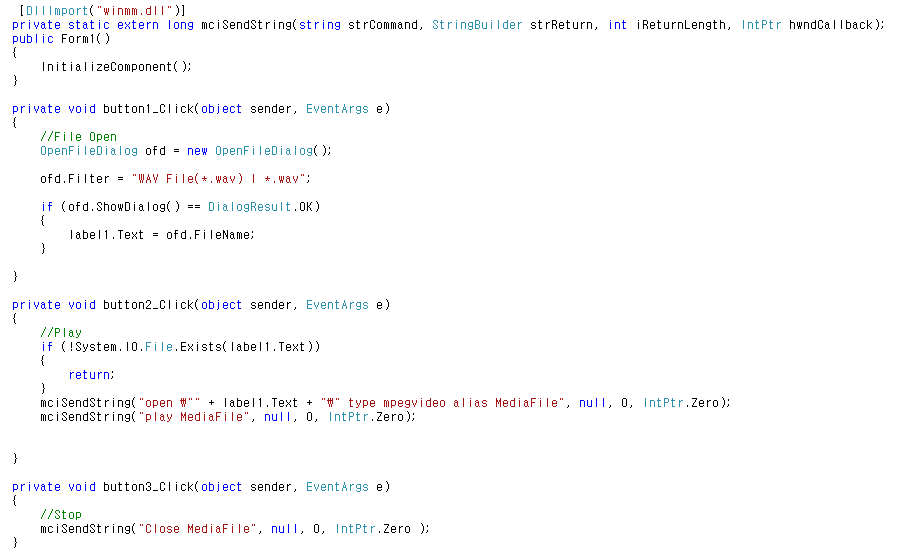 *VBNET API 를 이용한 Wav 파일 재생 예제... - 사용한 컨트롤 : Button 3개, Label 1개 전체 소스 코드 Form1.vb Imports System.Runtime.InteropServices Imports System.Text Public Class Form1 <dllimport("..< p=""> </dllimport("..<>