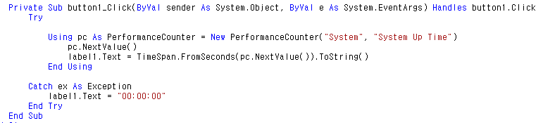Using pc As PerformanceCounter = New PerformanceCounter("System", "System Up Time")