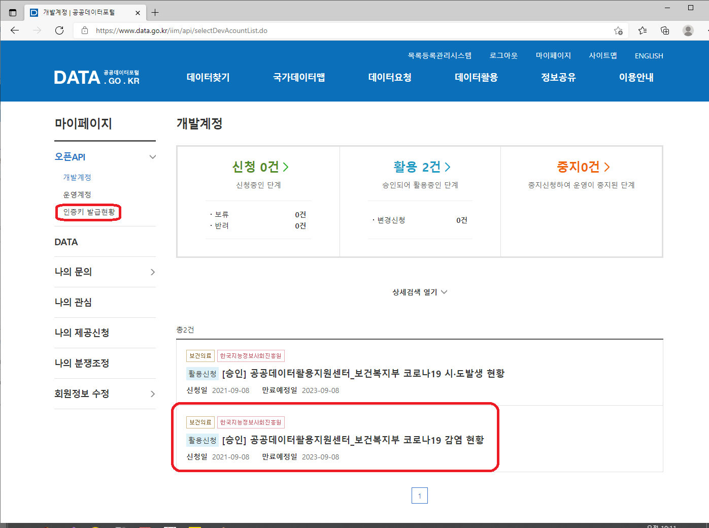 두번째로 인증키를 발급 받으셨다면 아까처럼 활용 신청이 완료 되면 위 그림과 같이 빨간색 테두리에