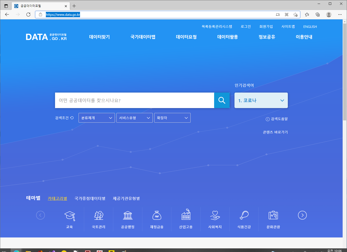 회원 가입이 되고 로그인을 하시면 위와 같은 메인 화면에서 "코로나" 라고 검색 하시면 됩니다.