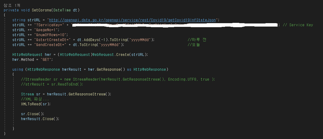 string strURL = "http://openapi.data.go.kr/openapi/service/rest/Covid19/getCovid19InfStateJson";