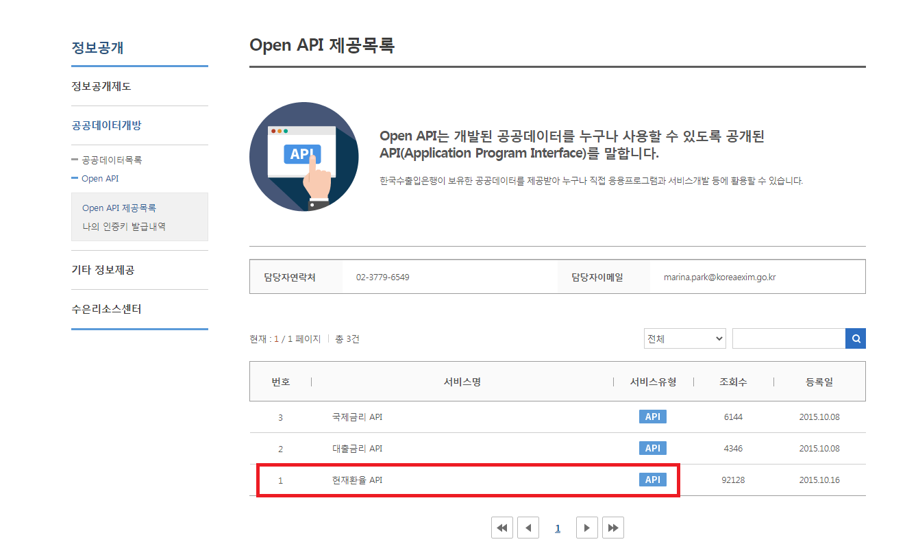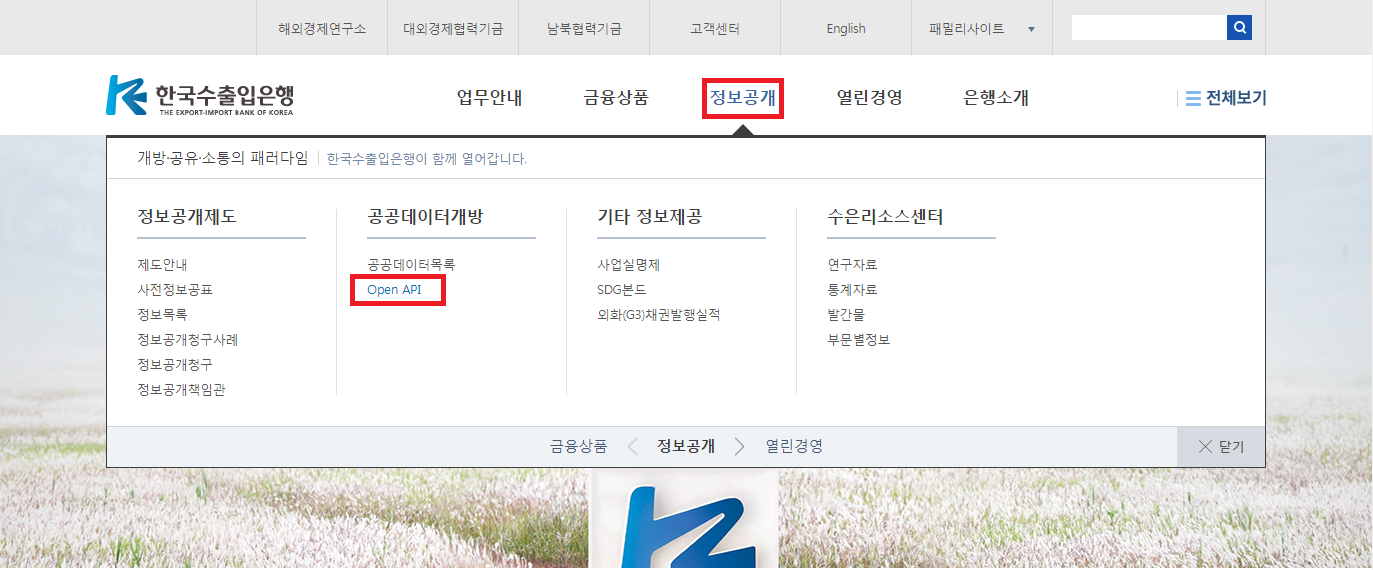 홈페이지에 접속 후 정보공개 -> Open API 메뉴 클릭