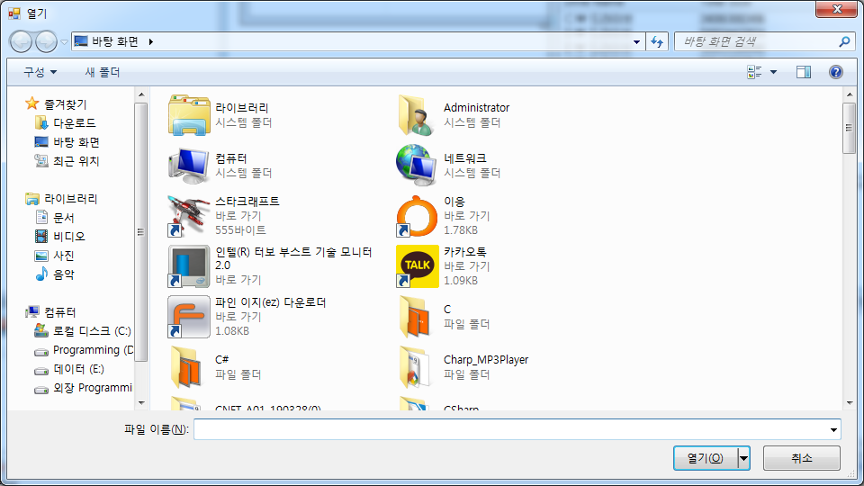 * 폴더 및 파일, 드라이브 목록 및 사이즈 구하기 예제 File Open 버튼 : 파일 대화 상자가 뜨게 되며, 해당 파일 선택 시 위 그림과 같이 파일의 위치 와 사이즈가 표시 됩니다. 다만 사이즈 표시는 기본 Byte..