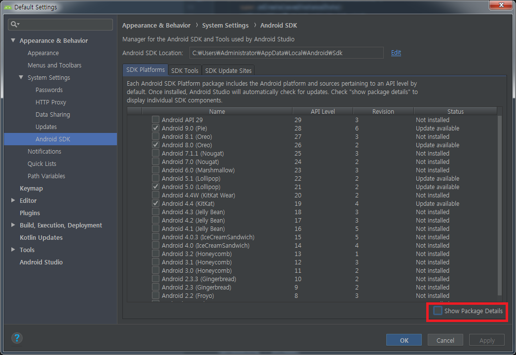Android SDK Location 은 스튜디오가 설치 될때 Default 폴더로 했기 때문에 위와 같이 나오게 되며, 혹