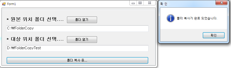 MessageBox.Show("폴더 복사가 완료 되었습니다.", "확 인", MessageBoxButtons.OK, MessageBoxIcon.Asterisk);