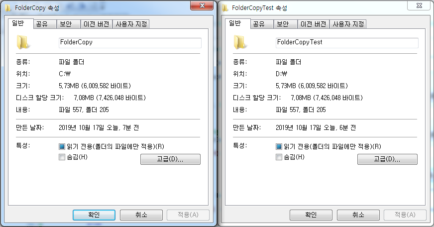 위 그림들은 테스트 결과 이미지들 입니다. 실제 복사가 정상적으로 이루어 졌는지 복사 하면서 잃게 된 용량은 없는지