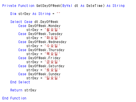 * 사용자 정의 함수 GetDayOfWeek => 요일 값을 문자열로 변환 하여 리턴 하는 함수