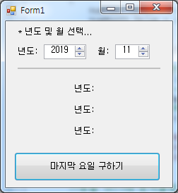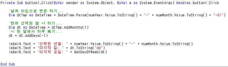 * DateTime Class 를 이용한 현재 선택된 달의 마지막 날짜 및 요일 구하기 예제...