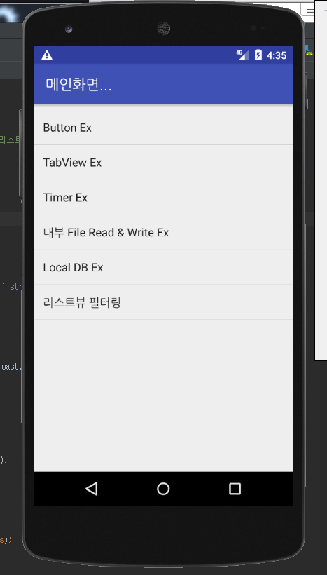 String[] strList = {"Button Ex", "TabView Ex", "Timer Ex", "내부 File Read & Write Ex", "Local DB Ex","리스트뷰 필터링"};