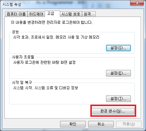 제어판 -> 시스템 -> 왼쪽 메뉴에서 고급 시스템 설정 (윈7)