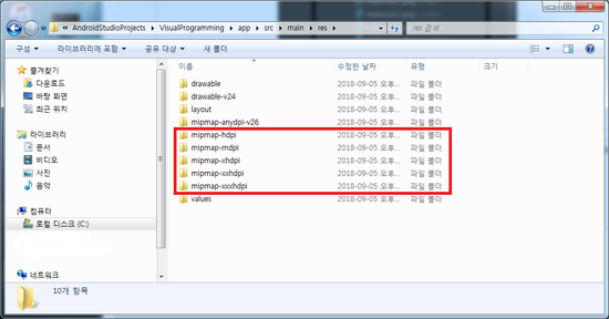 * 어플 아이콘 변경 방법 안드로이드를 설치 하고 프로젝트를 작성 했다면 C:\Users\Administrator\AndroidStudioProjects\VisualProgramming\app\src\main\res 위의 경로에 보통 만들어 짐. 위 폴더에 들어 가게..