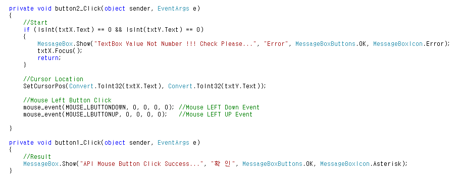 MessageBox.Show("API Mouse Button Click Success...", "확 인", MessageBoxButtons.OK, MessageBoxIcon.Asterisk);