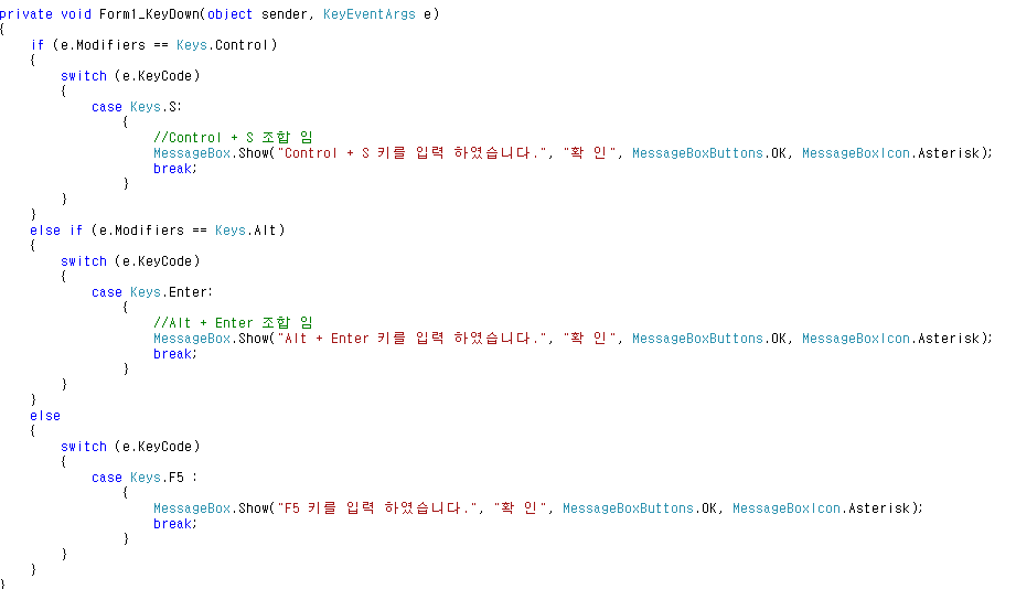 MessageBox.Show("Control + S 키를 입력 하였습니다.", "확 인", MessageBoxButtons.OK, MessageBoxIcon.Asterisk);