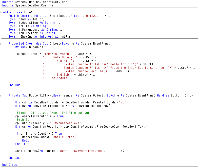 Dim cr As CompilerResults = cdp.CompileAssemblyFromSource(cp, TextBox1.Text)