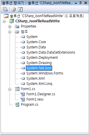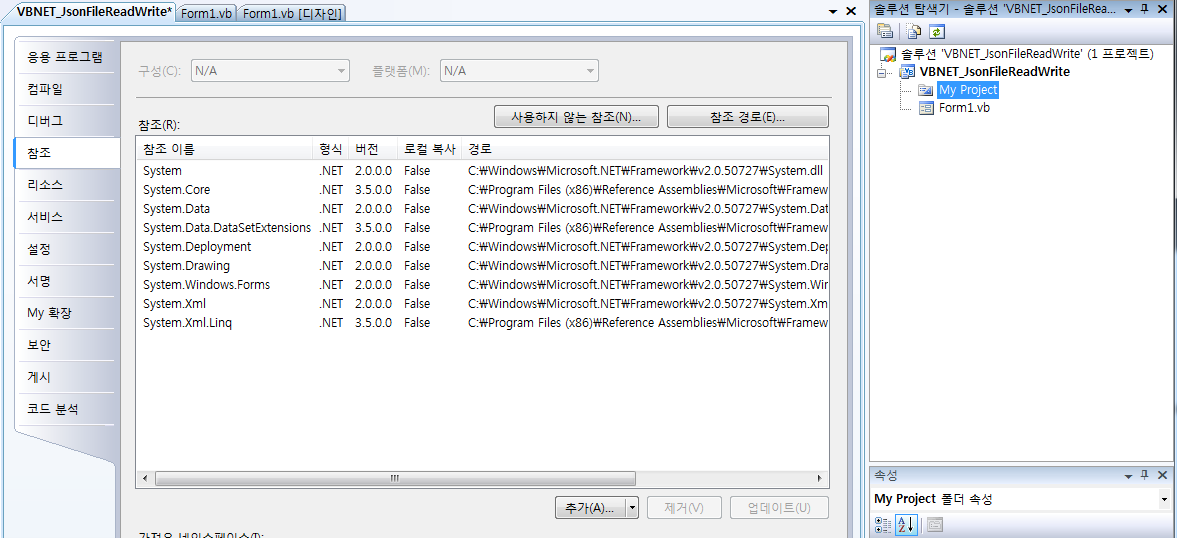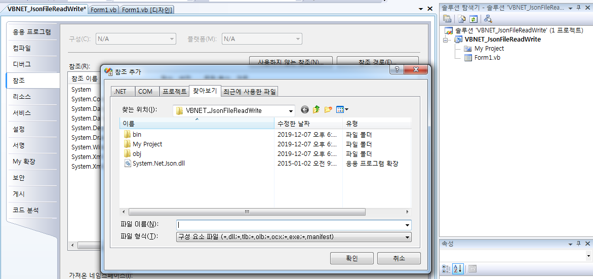 * VBNET Json 파일 읽고 쓰기 예제... (System.Net.Json.dll) 파일 참조 위 첨부된 파일을 다운 받아 dll 참조 추가를 해줍니다. 오른쪽에 솔루션 탐색기가 나타나지 않는다면, 상단 메뉴 (보기) -> (솔루션탐